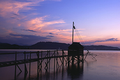 四ツ手網は、東郷湖に伝わる独特の仕掛け網で、四隅に竹を張り、湖岸の小屋から滑車で上げ下ろして、エビや小ブナなど取る漁法です。