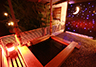 紅色に染まる夕日の湖畔の湯宿。広大な日本庭園は散策も楽しむことができます。